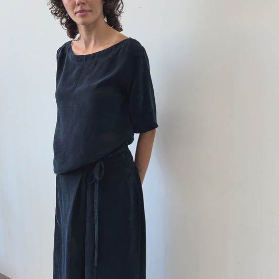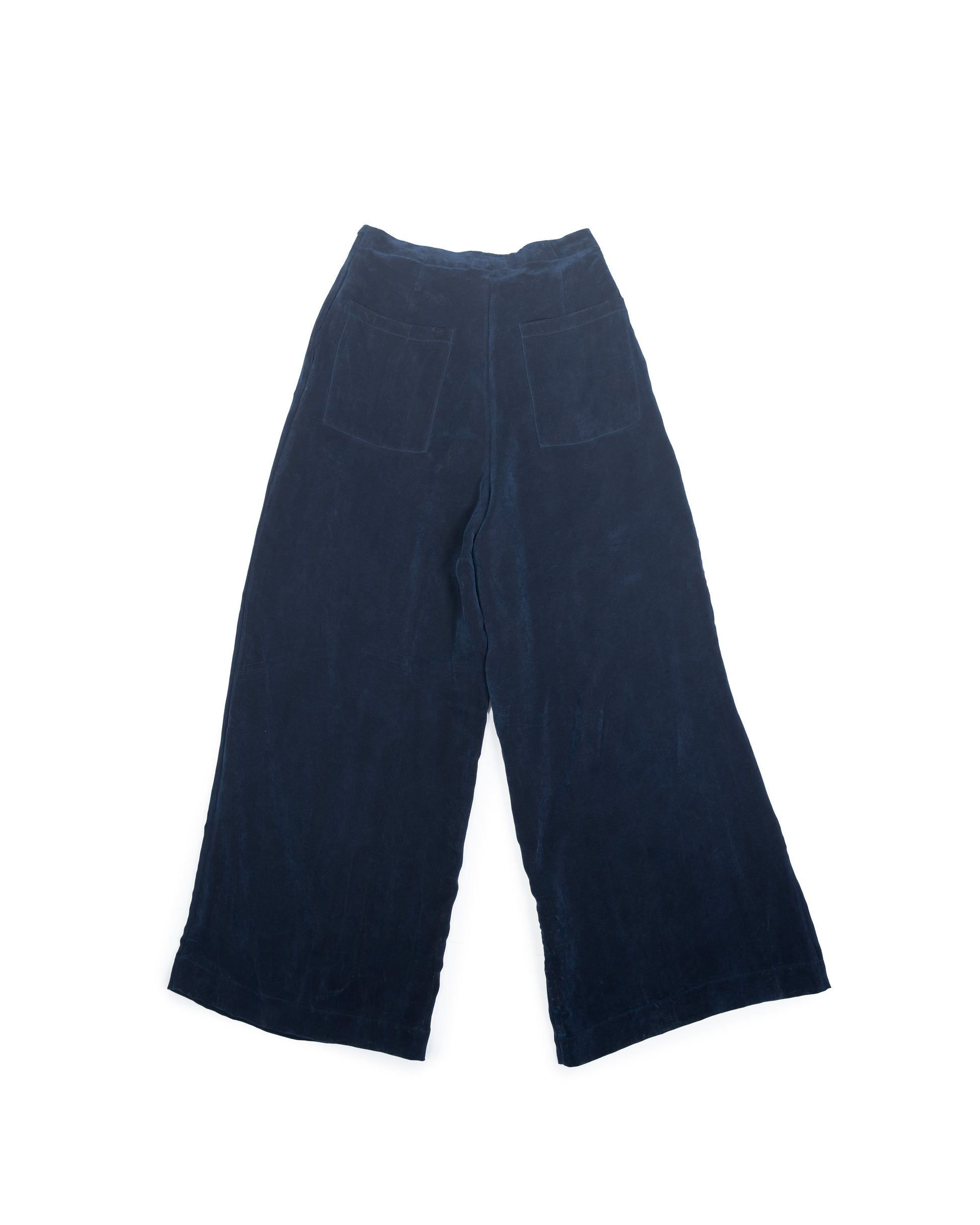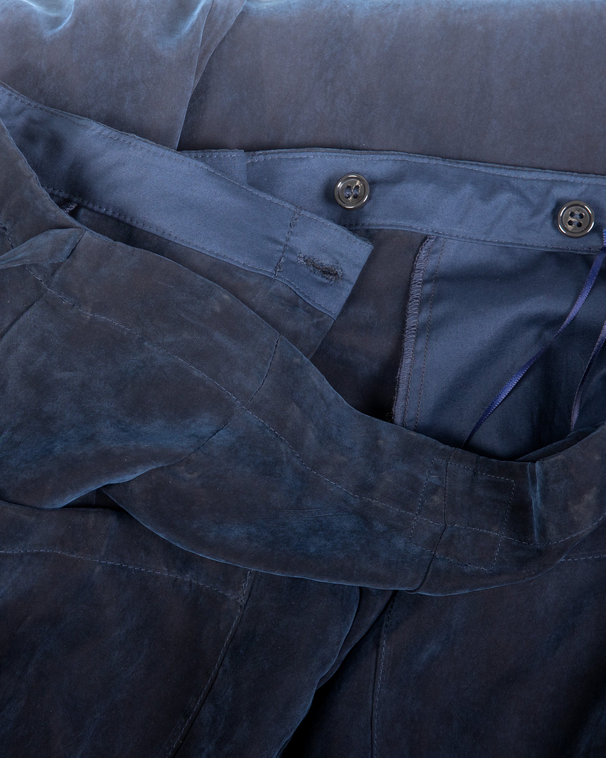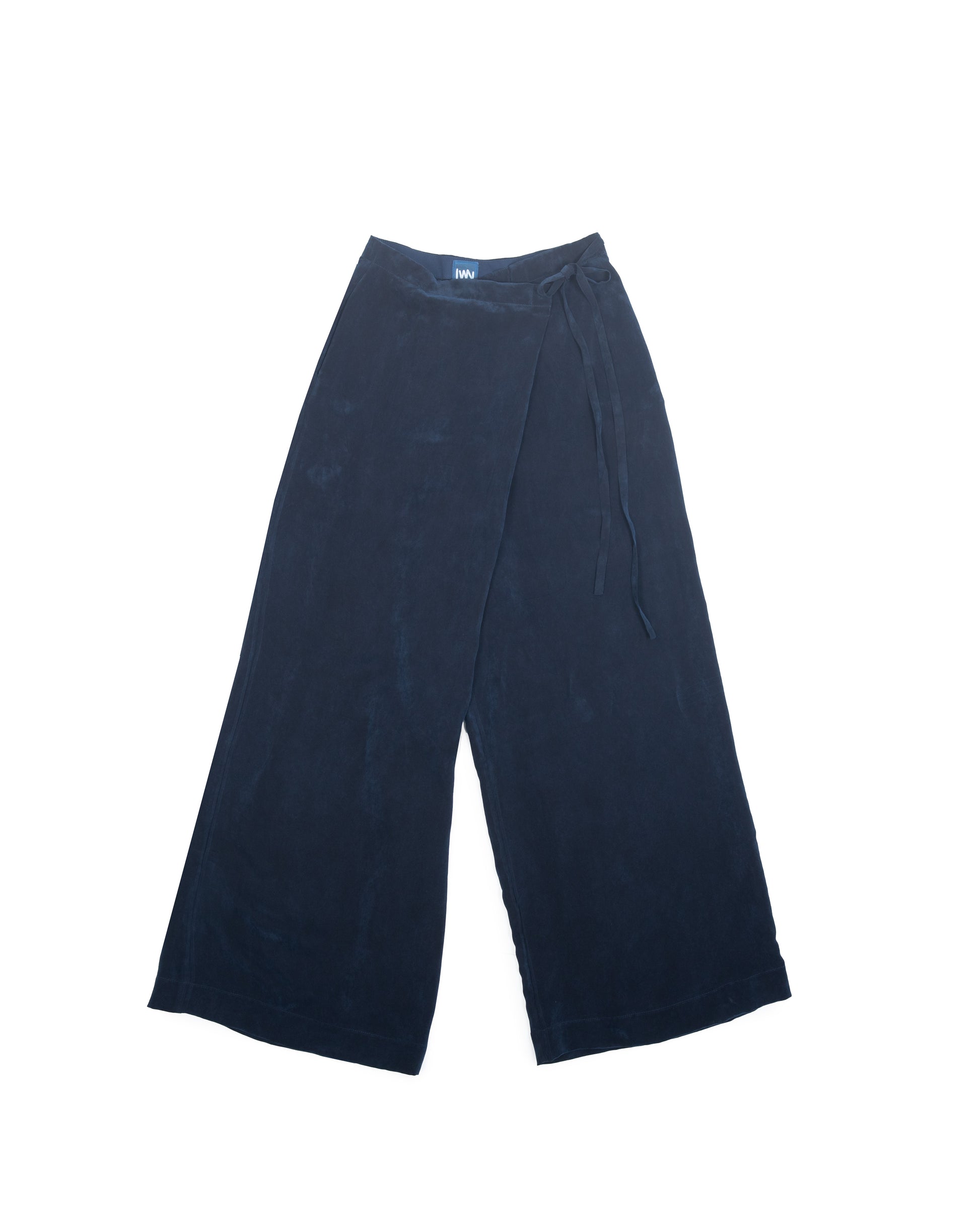 These long loose and lovely pants wrap at the waist and create a gentle drape and a fluid leg. This specially dyed cupro fabric has a subtle luminescence that glows in the soft folds of the wrap over. These pants suit many shapes and sizes with different button positions inside to close the waist, ties close the outside on your hip. This allows you to wear them higher on the waist or slung at the hip... or in my case the tighter position before dinner and the other later in the evening ;)