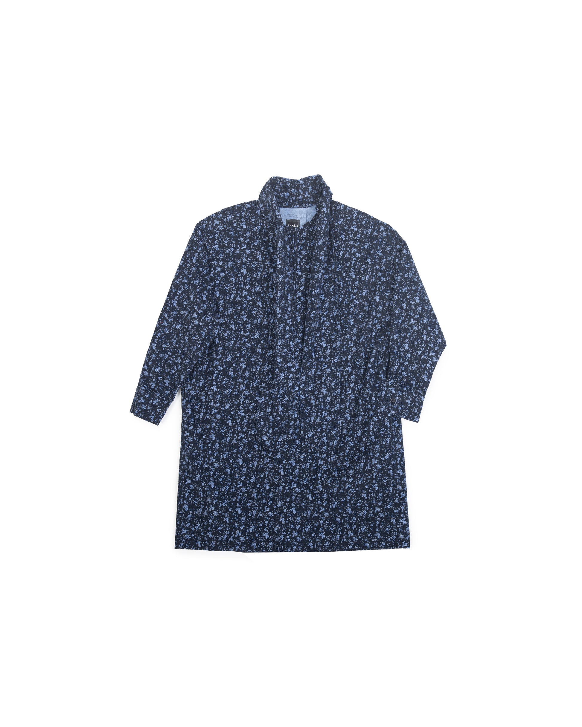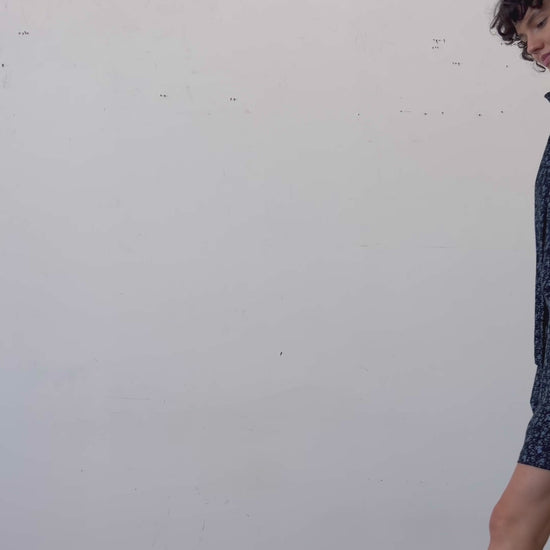Twiggy vibes with this tie-neck dress for the colder months. Wear with tights, boots or layer as a long top over pants. This dress has a deep pleat at the back and pockets on each side seam. Wear unbuttoned and layered over a top or done up with a bow.
