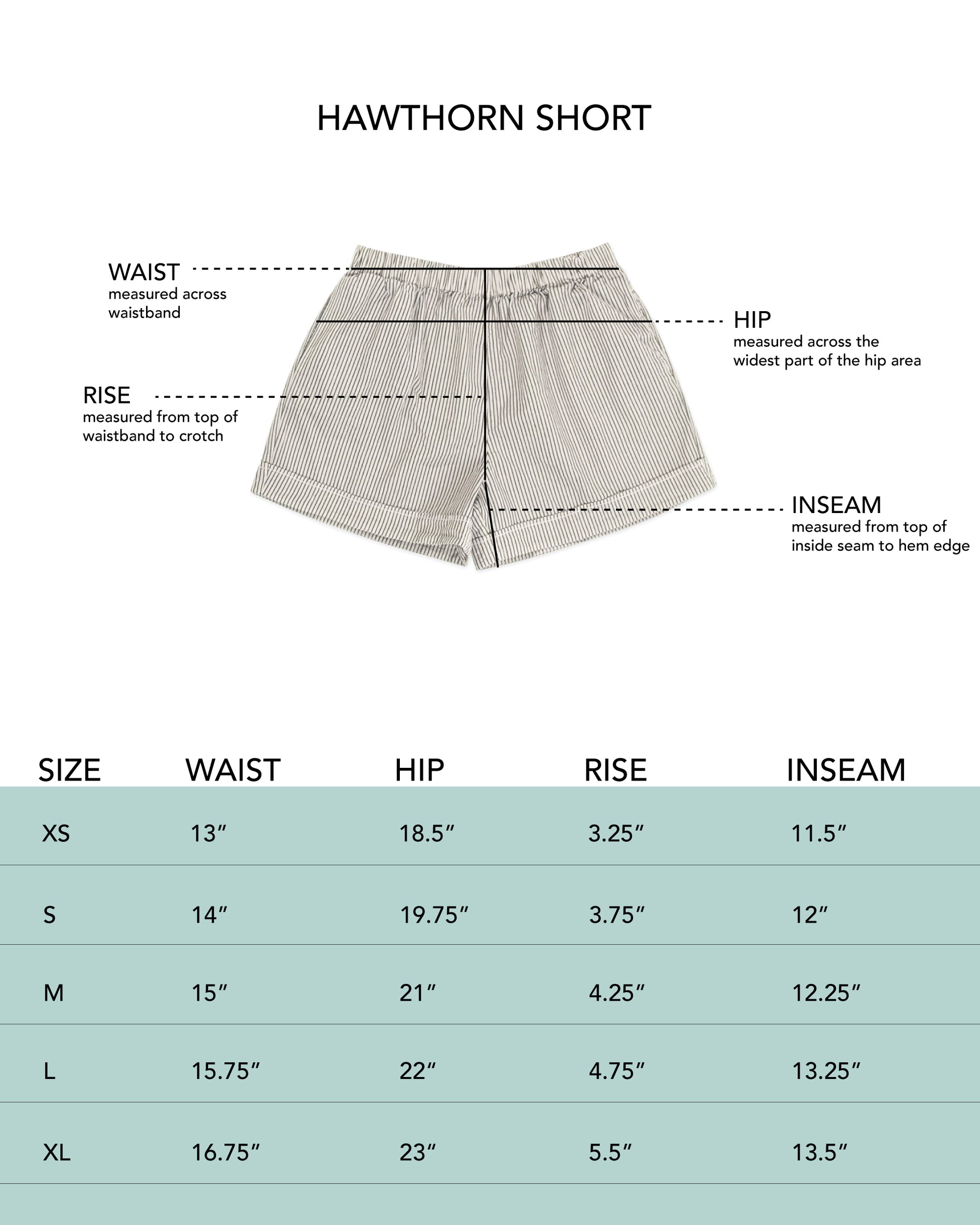 These turned up shorts, with side seam pockets and elasticated waistband, are easy to wear all day. Our pencil stripe fabric has an 80s vibe with black lines against a deep blue.