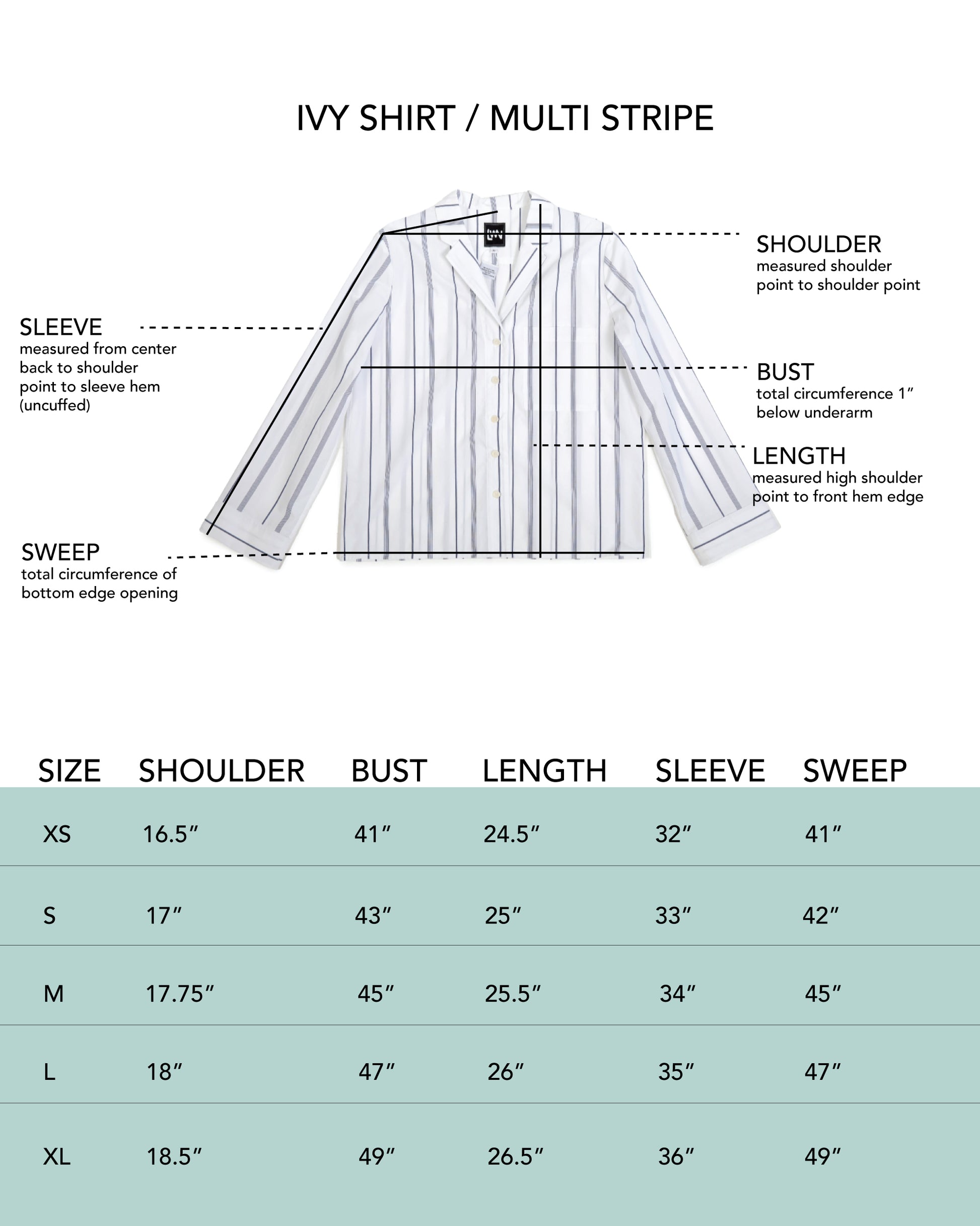 Ivy is an elevated take on the classic pajama shirt. A single chest pocket, notched collar, center front buttons, and sleeves finished in banded cuffs. This has a similar silhouette to our Cedar dress, with a break that lands just at the right point of the bust line.