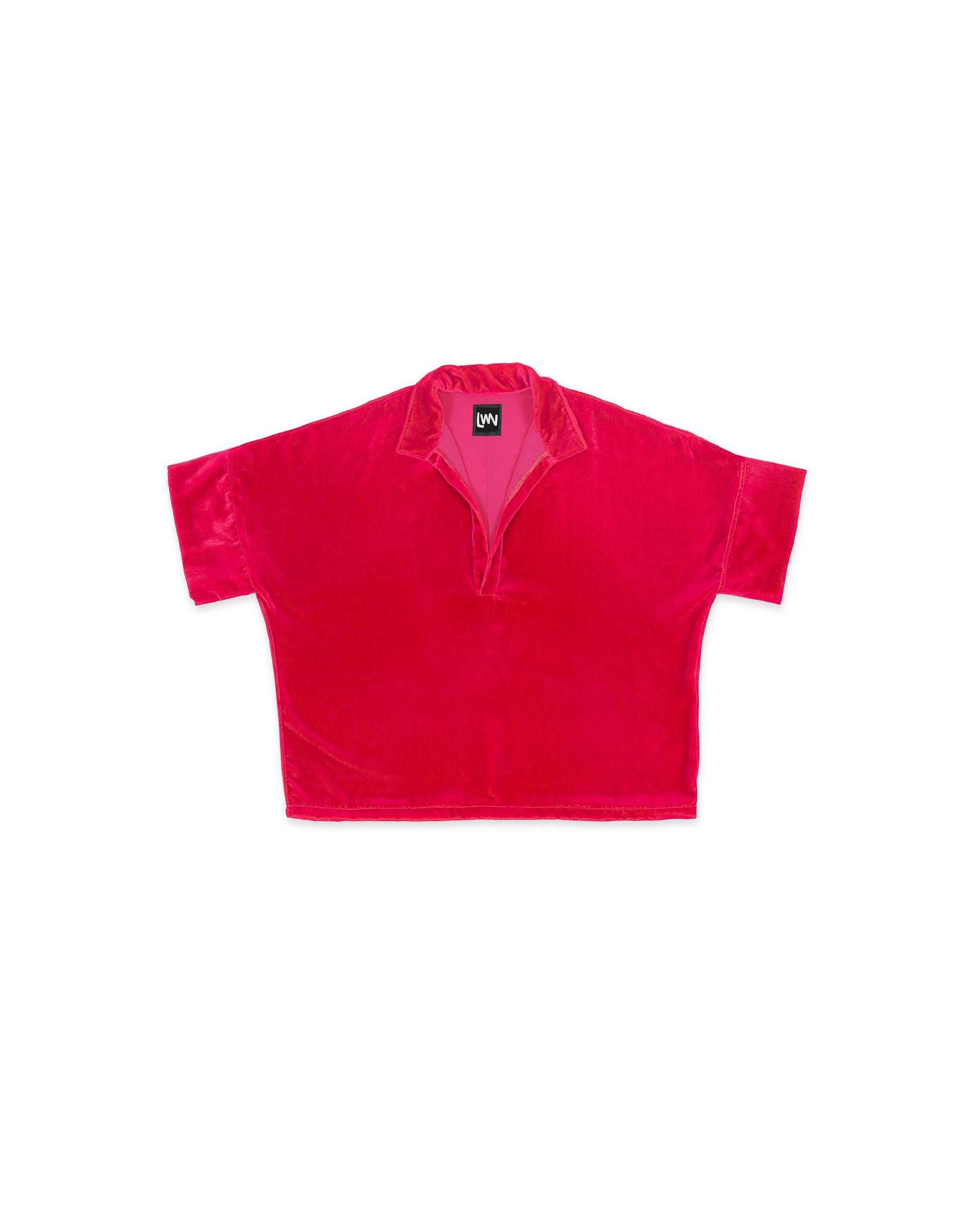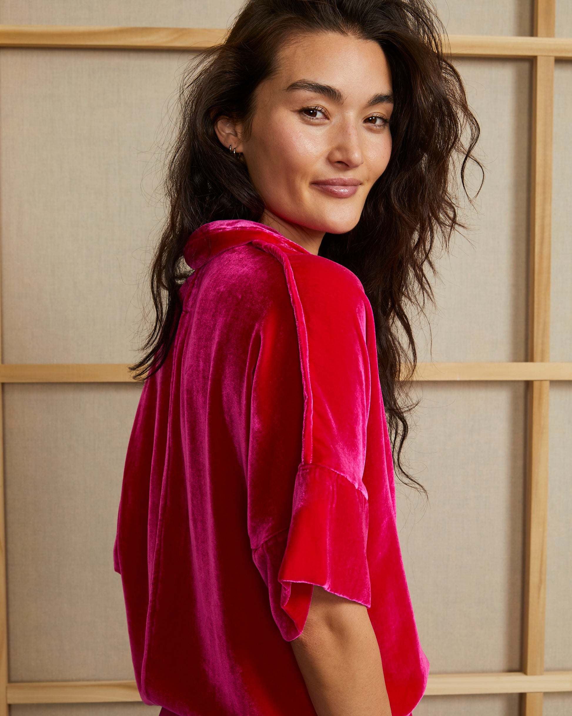 Our popular popover top, now in a luxurious silk velvet. One of our best-selling styles, Mugho has a boxy fit that makes it a great t-shirt alternative - easy but not overly casual. The relaxed collar frames a placket neck opening and the hem sits on the hip.