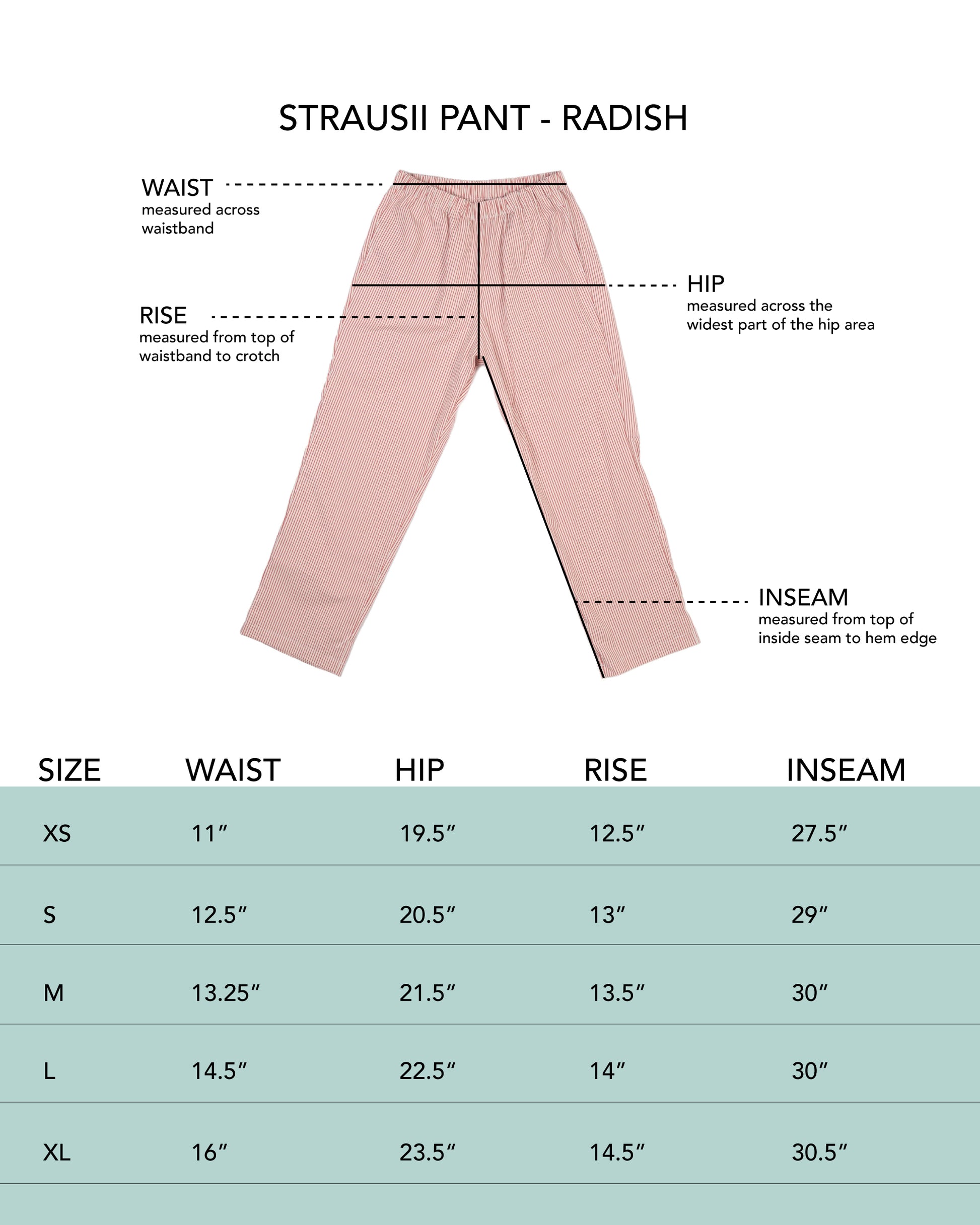 Strausii is our take on a classic pajama pant. A straight legged, easy pull-on with an elasticized waist and in-seam side pockets.
